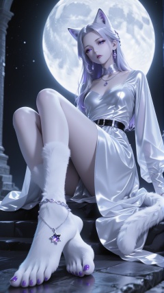 The image is a digital illustration of a young woman sitting on a black surface with a full moon in the background. She is wearing a white dress with long sleeves and a black belt around her waist. Her legs are crossed and her feet are bare,with purple nail polish on the toes. She has long white fur on her feet and is wearing silver earrings and a necklace. Her hair is styled in a half-up,half-down look with white cat ears on top. The overall mood of the image is dark and mysterious..,<lora:光辉大脚:0.8>,