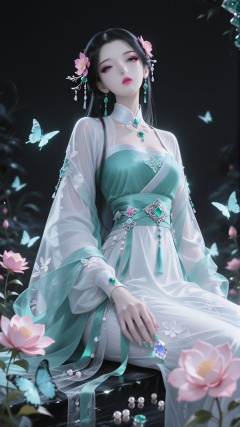 1girl,flower,solo,hair ornament,beads,pink flower,head tilt,gem,black hair,jewelry,pearl (gemstone),makeup,long hair,eyelashes,see-through,long sleeves,chinese clothes,looking at viewer,sitting,fingernails,bug,eyeshadow,earrings,hanfu,black background,butterfly,shawl,nail polish,lipstick,blurry,dress,hair flower,dark background,hair beads,<lora:光辉大脚:0.9>,