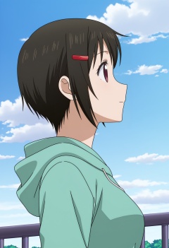 <lora:Nagisa KASHIWAGI_illustrious-000030:1>,Nagisa KASHIWAGI,solo,hair ornament,hairclip,hood,hoodie,sky,outdoors,cloud,day,from side,profile,anime screencap,