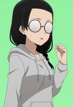<lora:Kobachi Osaragi_illustrious-000022:1>,Kobachi Osaragi,glasses,hoodie,hood,green background,braid,opaque glasses,grey hoodie,sweatdrop,upper body,hand up,open mouth,hood down,drawstring,simple background,long sleeves,solo,anime screencap,