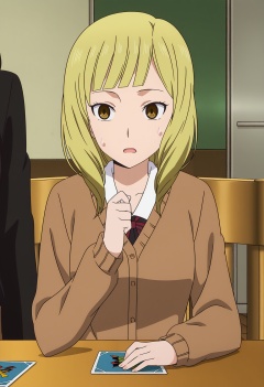 <lora:Onodera Rei_illustrious-000058:1>,Onodera Rei,school uniform,sitting,sweatdrop,cardigan,out of frame,long sleeves,open mouth,table,card,chair,anime screencap,blonde,