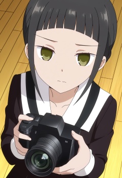 <lora:Kose Erika_illustrious-000018:1>,1girl,Kose Erika,solo,school uniform,camera,looking at viewer,holding,wooden floor,holding camera,upper body,long sleeves,collarbone,dress,closed mouth,single hair bun,sidelocks,anime screencap,