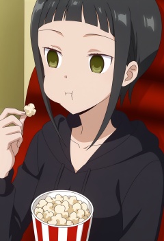 <lora:Kose Erika_illustrious-000018:1>,1girl,Kose Erika,solo,food,hood,popcorn,eating,hoodie,:t,holding,sidelocks,holding food,upper body,collarbone,anime screencap,