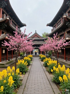 Ancient Chinese Tang Dynasty buildings, with very beautiful flowers on both sides of the roads of the buildings,Cherry blossoms,golden rapeseed,wooden houses