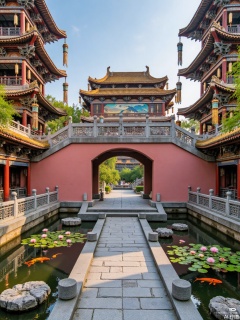 In ancient China, a bluestone path winds to the front of the Yue Cave gate. The brick-carved peonies on the lintel are blooming brightly, and the petals are visible. The pink wall embraces a pool of clear water, the water lilies float lazily on the water, and the koi shuttles between the Taihu stones. The paintings of the heavy towers in the distance are stacked up, and the glazed tiles are shining with gold-like light in the sun, and the jade bells hanging from the eaves are jingling, turning the classical charm into a long ancient song.