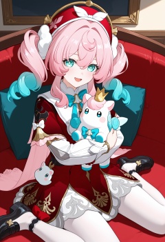 <lora:hal illustrious-1.0-000050:1>,little ica \(honkai: star rail\),hyacine \(honkai: star rail\),pink hair,smile,red dress,twintails,open mouth,looking at viewer,long sleeves,red hat,blue bow,bowtie,long hair,blue bowtie,hair between eyes,blush,:d,solo,ribbon,aqua eyes,hand up,multicolored hair,blue eyes,blue hair,holding,hug,cowboy_shot,white pantyhose,black footwear,wariza,full body,