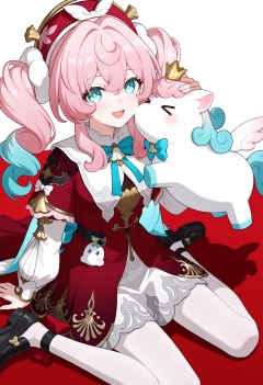<lora:hal illustrious-1.0-000050:1>,little ica \(honkai: star rail\),hyacine \(honkai: star rail\),pink hair,smile,red dress,twintails,open mouth,looking at viewer,long sleeves,red hat,blue bow,bowtie,long hair,blue bowtie,hair between eyes,blush,:d,solo,ribbon,aqua eyes,hand up,multicolored hair,blue eyes,blue hair,cowboy_shot,white pantyhose,black footwear,wariza,full body,>_<,open eyes,kiss,mutual kiss,1girl,solo,