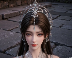 The image depicts a close-up of a character wearing an elaborate, ornate headpiece adorned with intricate silver designs and turquoise gemstones. The character has long, dark hair and is dressed in traditional attire that appears to be light-colored, possibly white or cream. The background consists of a stone or concrete surface, suggesting an outdoor or ancient setting. The overall aesthetic is highly detailed and stylized, typical of digital art or animation.