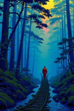 beijihui,a monk walking across a misty bamboo bridge at dawn, distant waterfall echoes, deep forest zen landscape