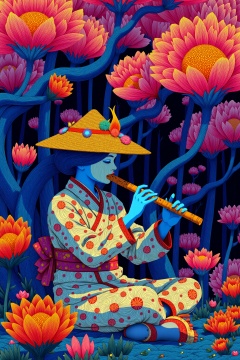 beijihui,An eye-level painting of a Asian woman dressed in a traditional kimono,holding a flute in her right hand. The woman's face is covered in blue hair,and she is wearing a straw hat with a flower on it,and blue gloves. Her dress is adorned with a pattern of flowers,and the flute she is holding is **** of wood. The background of the painting is a deep blue,and there are a variety of vibrant flowers,including pink,orange,and purple. The flowers are arranged in a way that creates a striking contrast to the blue background.,