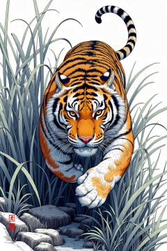 beijihui,a tiger in motion leaping through tall grass,powerful and majestic,Chinese ink-style portrait,
