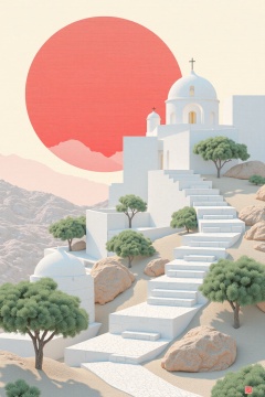 beijihui,The image depicts a serene and picturesque landscape with a large red sun setting or rising in the background, casting a warm glow over the scene. The foreground features a white stone staircase leading up to a white building with a dome, which is situated on a high elevation. The building is surrounded by a white wall, and there are small green trees and rocky terrain visible around the staircase. The overall color palette is soft and muted, with the red sun providing a striking contrast against the predominantly white and green landscape. The scene evokes a sense of tranquility and timelessness, reminiscent of a Mediterranean or desert environment.