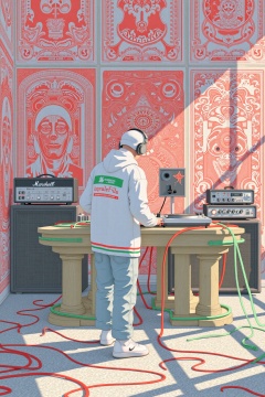 beijihui,The image depicts a person wearing a white hoodie with green and red stripes, standing in front of a turntable setup. The individual is wearing headphones and appears to be engaged in mixing music. Behind the person, there are several electronic devices, including a guitar amplifier and a digital audio workstation (DAW) with knobs and sliders. The room has a wall covered with intricate red and white patterns, which resemble posters or artwork. The floor is covered with a textured surface, and there are red and green wires scattered around. The lighting creates a warm and vibrant atmosphere, with sunlight streaming in from the right side. The overall setting suggests a creative and artistic environment, possibly a music studio.