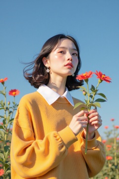 beijihui,A young woman stands under a cloudless blue sky,wearing an oversized mustard yellow sweater with a crisp white collar. She holds a bright red flower in her hands,her gaze serene as she is lost in the moment. The golden sunlight casts soft shadows on her skin,enhancing the warm,nostalgic tones. The image has the aesthetic of a vintage film,with rich and saturated colors,evoking a sense of contemplation and natural beauty. The scene exudes simplicity,harmony,and a deep connection with nature.,