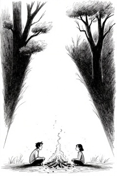 beijihui,A black and white drawing of a man and woman sitting in front of a fire. The man is sitting on the ground with his hands on his knees. The woman is sitting with her hands on her knees. She is looking at the man with her eyes closed. The fire is burning in the middle of the image. There is a large tree to the right of the man. The tree is casting a shadow on the left and right sides of the scene.
