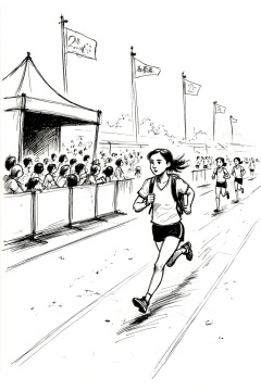 beijihui,A black and white sketch of a woman running on a track. The woman running is wearing a white shirt, black shorts, and black shoes. She has a backpack on her back. Her hair is dark brown and she has a ponytail. There is a crowd of people in the background behind her. A large tent is on the left side of the image.
