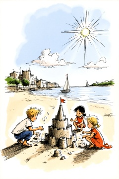 beijihui,A medium-sized sketch of two children, a boy and a girl, playing with a sand castle. The boy is on the left side of the image, looking at the sand castle, while the girl on the right side is sitting on the sand. The girl has blonde hair, and the girl has black hair. The sand castle is in the foreground, and there is a sailboat in the background. The sailboat is sailing on a body of water. The sun is shining in the upper right corner of the frame. The sky is a light blue, with a few white clouds.