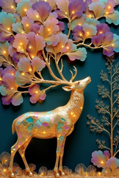 beijihui,Captured from an eye-level perspective,a golden reindeer stands in front of a backdrop of a tree. The deer's head is facing the right side of the frame,its head turned slightly to the left. The tree's branches are adorned with a variety of vibrant colors,including purple,pink,blue,and green. The leaves of the tree are detailed,adding a touch of nature to the scene. To the right of the deer,a tree branch is adorned with small white lights. The background is a deep blue,creating a striking contrast with the deer and the trees.,
