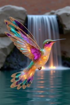 beijihui,Captured at eye-level,a hummingbird is soaring over a body of water. The hummingbird's wings are adorned with a variety of vibrant colors,including purple,orange,yellow,green,and blue. The bird's beak is long and pointed,and its eyes are black. In the backdrop,a waterfall can be seen,and a rock wall is visible.,