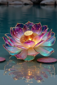 beijihui,a close-up eye-level shot captures a vibrant pink lotus floating on a body of water. The petals of the lotus are a mix of purple,pink,and yellow,and the center of the flower is adorned with a cluster of dots. The flower's petals are reflected in the water,adding a touch of depth to the image. The background is blurred,allowing the flower to be the focal point of the shot.,