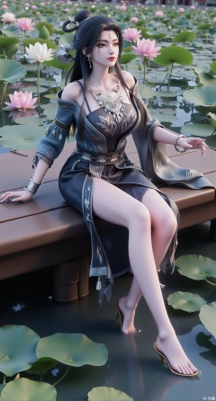 (masterpiece:1.2),best quality,The image is a digital illustration of a young woman sitting on a wooden bench in a pond with lily pads. She is wearing a long dress with design on the chest and sleeves. The dress has a high neckline and short sleeves,Holding a lotus in hand. She has long dark hair styled in loose waves and is wearing gold high heels. The woman is posing with one hand on her hip and the other resting on the edge of the bench. The background is filled with pink and white lotus flowers and green leaves. The overall mood of the image is peaceful and serene,(huge breasts:2.99),(full breasts:2.99),(Background with traditional Chinese architecture, lotus pond and pink lotus flowers:1.39),XliumeiYK,XlishaoyingXK,XyunxiaoYK,XxiaobaiYK