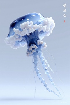beijihui,a clear jellyfish is suspended in mid-air against a light blue backdrop. The jellyfish's head is adorned with white bubbles,adding a pop of color to the otherwise monochromatic composition. The backdrop is a stark light blue,creating a stark contrast to the jellyfish. To the top right corner of the frame,a small Asian character is visible.,