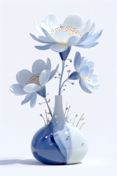 beijihui,A 3D rendering of a blue glass vase with a white flower in the middle. The vase is made up of a light blue glass that has a reflection of the flower on it. There are three white flowers in the vase. The flowers have small holes in them that are sticking out of them. There is a white background behind the flowers.