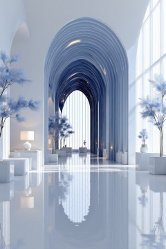 beijihui,Captured at eye-level on a low-angle perspective, the interior of a modern building is adorned with a blue arched ceiling. The floor is glossy and reflective, creating a stark contrast to the white walls and floor. The arches are adorned with delicate white flowers, adding a touch of nature to the scene. To the right of the arches, a white table with a lamp on top is positioned on the left side of the frame. The lamp is positioned in the middle of the room, adding depth to the overall composition.