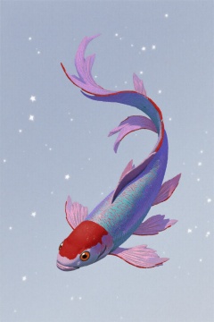 beijihui,An eye-level view of a vibrant red fish with a long tail. The fish's head is facing to the left, and its eyes are a bright orange. The tail is a vibrant shade of pink, with a darker shade of purple at the bottom, and a lighter shade of blue at the top. The background is a grayish gray, and there are a few white stars visible in the top right corner of the image.