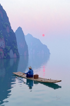 beijihui,a man in a blue shirt and a straw hat is rowing a bamboo boat on a body of water. The boat is adorned with a brown basket and a brown oar. The man's face is turned towards the left side of the frame. The sun is setting in the background, casting a pink hue over the mountains. The mountains are reflected in the water, their shadows cast on the surface of the water.