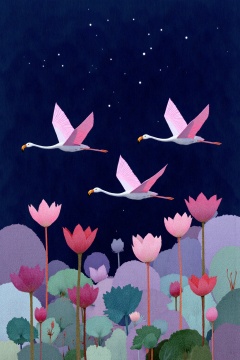 beijihui,Captured at eye-level, a medium-sized painting of a pink flamingo flying over a field of lily pads. The flamingos are flying in the sky, their wings spread wide open, while their tails are bent at the tips of their necks. The lilies are scattered throughout the painting, their vibrant colors are a mix of pink, purple, and green. The background of the painting is a deep blue, with a few stars visible in the night sky.