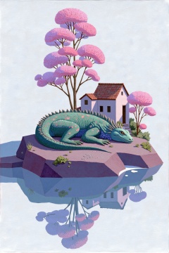 beijihui,Captured in a medium-sized painting, a green iguana is lying on a rock formation. The iguana's head is facing the right side of the frame, its eyes closed. Its body is angled slightly to the left, and its head is turned to the right. The background is a light gray, and there is a tree with pink flowers on the right of the iguana. There is a small house on the left side, and a brown roof on the top right corner of the image. The tree is casting a shadow on the water, and the reflection of the tree is visible on the surface of the water.