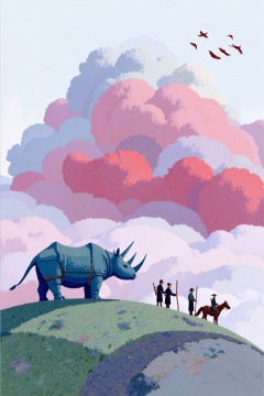 beijihui,Captured at eye-level on a medium-sized painting,a blue rhino is standing on a grassy hill with a harness on its back. The rhino's head is adorned with two horns,one on each side of its head and the other on its hind legs. Two men are standing on the right side of the rhino,each holding a long stick in their hands. They are dressed in dark clothing,with hats on their heads. A third man is on a brown horse in the background,looking at the rhinoceros. The background is a vibrant shade of pink,with a large cloud in the upper right corner of the frame,adding a pop of color to the scene. To the right of the image,a few red birds are flying in the sky.,