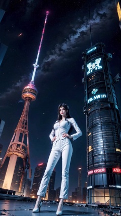 The image depicts a futuristic cityscape at night, illuminated by neon lights and stars in the sky. A woman in a sleek white suit stands prominently in the foreground, her posture confident and assertive. She is surrounded by floating screens and debris, suggesting a post-apocalyptic or cyberpunk setting. The background features towering buildings with glowing signs and a galaxy visible in the sky, adding to the sci-fi atmosphere. The overall scene is dark and vibrant, with a mix of technology and nature.