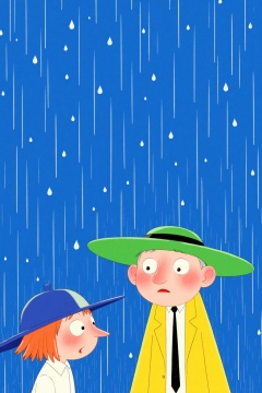 beijihui,Captured in a cartoon,two cartoon characters are standing in front of a backdrop of raindrops. The character on the left is wearing a blue hat,while the one on the right has a yellow jacket and a white shirt with a black tie. Both of the characters are facing the same direction. The background is a deep blue,and there are white raindrops falling from the sky.,