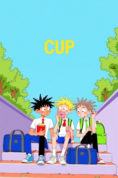 beijihui,Captured from an animated cartoon, three boys are sitting on a set of stairs. Two of the boys are wearing white shirts and blue pants, while the other boy is wearing a white shirt and black pants. The boy on the left is holding a red book in his hands. He has a red bow on his head and a red tie around his neck. The second boy is eating a donut. He is also wearing a green backpack. The third boy is also holding a green bag. There is a blue duffel bag on the stairs in front of them. There are trees on the right and left side of the stairs. The sky is a light blue color. Above the stairs is a text that reads "CUP," in yellow letters.