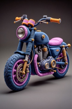 beijihui,a miniature model of a blue and pink motorcycle is displayed on a gray surface. The motorcycle is made of a soft, fuzzy material, with a blue body and pink accents. The handlebars are adorned with orange knobs, adding a pop of color to the scene. The front wheel of the motorcycle is adorned with a gold chain, while the rear wheel is adorned in a purplish hue. The background is a solid gray, providing a stark contrast to the motorcycle.