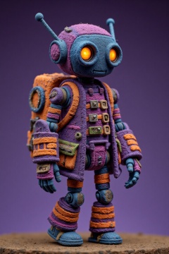 beijihui,a small toy robot is standing on a brown surface. The robot is adorned with a purple jumpsuit, adorned with orange and green stripes. The eyes of the robot are glowing with a yellow hue, adding a pop of color to the scene. The background is a vibrant purple, creating a striking contrast to the figure.