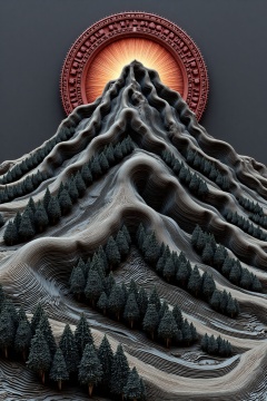 beijihui,a 3D rendering of a mountain is depicted. The mountain is made up of thin,wavy lines that create a striking contrast to the dark gray background. At the top of the mountain,a circular archway is visible,adding a touch of depth to the image. The archway,a vibrant shade of red,is encircled by a series of dark green trees. The trees are arranged in a way that creates a sense of depth and dimension.,