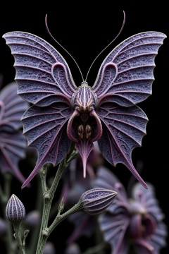 beijihui,A close-up,eye-level view of a purple butterfly,with a black background. The butterfly's wings are a vibrant shade of purple,and the butterfly's body is adorned with a intricate intricate pattern of lines and shapes,adding a touch of depth to the image. The moth's eyes are a darker shade of brown,while the stem is a lighter shade of green. The background is a solid black,creating a stark contrast to the moth's wings.,