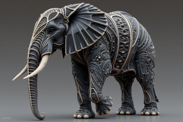 beijihui,Captured in a low-angle perspective, a medium-sized black and white elephant stands on a gray surface. The elephant's trunk is adorned with a white tusk, adding a touch of contrast to its black body. Its trunk is encased in a intricate pattern of white lines, adding depth to the composition. The background is a solid gray, creating a stark contrast to the elephant's body.