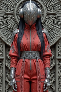 beijihui,a close-up shot of a star wars character stands in front of a gray wall adorned with intricate carvings. The character is dressed in a vibrant red outfit, adorned with a silver belt and a silver helmet. The helmet is adorned with silver earbuds, adding a pop of color to the scene. The outfit is adorned by a pair of silver gloves, adding contrast to the overall composition.