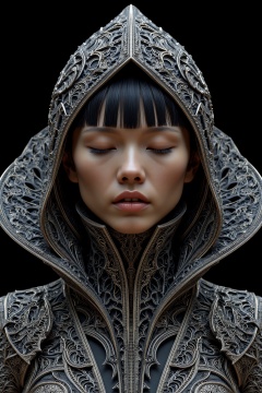beijihui,a close-up shot of a woman's face is visible. The woman's eyes are closed,her lips are slightly parted,and her hair is a dark shade of black. She is wearing a black dress adorned with intricate carvings and designs. The dress is adorned with a hood that covers her head,adding a touch of warmth to the scene. The background is a solid black,creating a stark contrast to the woman's dress.,