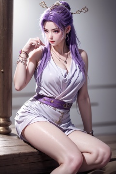 <lora:01云霄第一版:1>,1girl,jewelry,purple hair,solo,necklace,sitting,long hair,ponytail,dress,bracelet,hair ornament,white dress,arm up,bare legs,closed mouth,