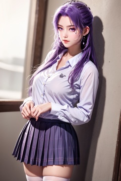 <lora:01云霄第一版:1>,1girl,purple hair,skirt,solo,thighhighs,purple eyes,long hair,shirt,white thighhighs,looking at viewer,white shirt,earrings,jewelry,collared shirt,plaid,plaid skirt,cowboy shot,long sleeves,pleated skirt,standing,school uniform,