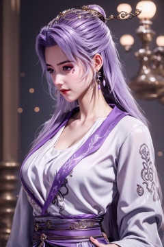 <lora:01云霄第一版:1>,1girl,solo,hair ornament,long hair,hair bun,upper body,jewelry,dress,earrings,single hair bun,chinese clothes,realistic,closed mouth,purple hair,