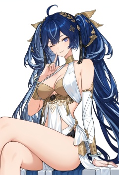 <lora:Younuo (wuthering waves)_Illustrious-000112:1>,Younuo \(wuthering waves\),solo,breasts,long hair,dress,looking at viewer,jewelry,white dress,smile,bare shoulders,bracelet,very long hair,hair ornament,medium breasts,ahoge,multicolored hair,parted lips,detached sleeves,cleavage,white_background,blue hair,belly,cowboy_shot,single sleeve,sitting,crossed_legs,seductive_smile,shushing,wink,