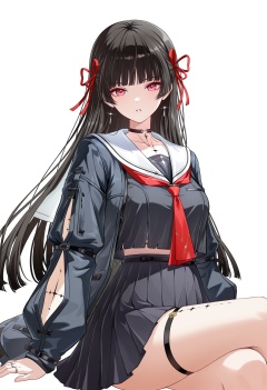 <lora:chisa (wuthering waves)_Illustrious-000128:1>,chisa \(wuthering waves\),solo,skirt,looking at viewer,school uniform,hair ribbon,ribbon,white ring,black serafuku,pleated skirt,choker,black skirt,parted lips,sailor collar,long sleeves,red ribbon,jewelry,blunt bangs,shirt,red neckerchief,black shirt,cowboy shot,black choker,white sailor collar,jacket,white_background,thigh strap,cowboy_shot,front view,sitting,crossed_legs,