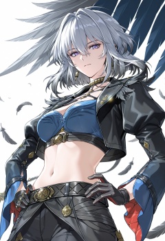 <lora:galbrena (wuthering waves)_Illustrious-000166:1>,galbrena \(wuthering waves\),solo,gloves,black gloves,breasts,cropped jacket,looking at viewer,long sleeves,jacket,pants,black jacket,midriff,jewelry,belt,medium breasts,feathers,black pants,cowboy shot,closed mouth,puffy sleeves,crop top,choker,earrings,navel,juliet sleeves,fur trim,open jacket,open clothes,white_background,(front view:1.2),hands_on_hips,