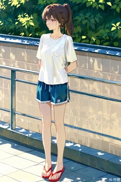 ponytail,su moting,red shoes,1girl,white t-shirt,blue shorts,flip-flops,breast pocket,Sketch style,Futurism